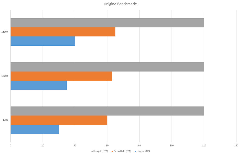 Unigine test de grafische prestaties van je computer. Ook al is de grafische kaart het belangrijkste bij dit soort testen, is de processor ook zeer van belang. Nu hadden wij alleen een GTX 1050 ti beschikbaar en dit zorgt voor een bottleneck, hierdoor kwamen de processoren niet tot hun recht. Wanneer de processoren met een betere videokaart worden gebruikt zullen de prestaties beter zijn.