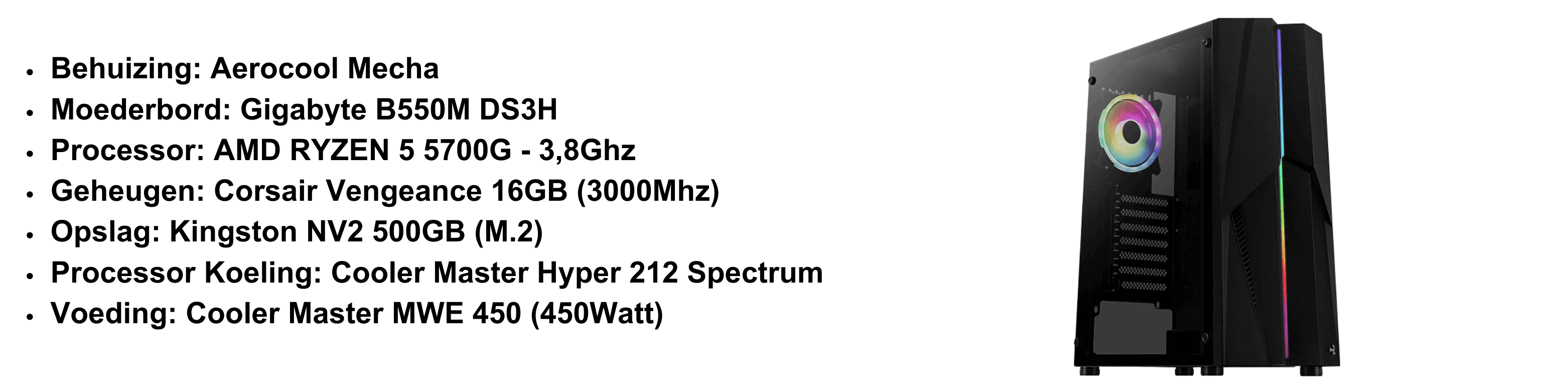 Deze samenstelling is specifiek ontworpen voor gamers die willen genieten van games zoals GTA 5 en Minecraft zonder diep in de buidel te tasten. Deze build is geoptimaliseerd voor lichtere games. De computer is uitgerust met een processor met geïntegreerde graphics, waardoor een aparte videokaart niet nodig is.