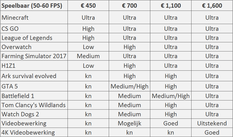 Hieronder vindt je een overzicht van veel gespeelde spellen met daarbij de prestaties van de verschillende samenstellingen. Staat het spel wat jij graag wilt spelen er niet tussen? Neem dan contact met één van onze product experts!